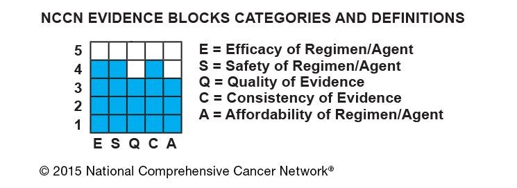The National Comprehensive Cancer Network (NCCN) recently released a treatment rating system they call “Evidence Blocks” for myeloma treatment. These grids add categories and definitions to the usual lists of recommended therapies provided by NCCN. The categories are: efficacy, safety, quality of evidence, consistency of evidence and expense.